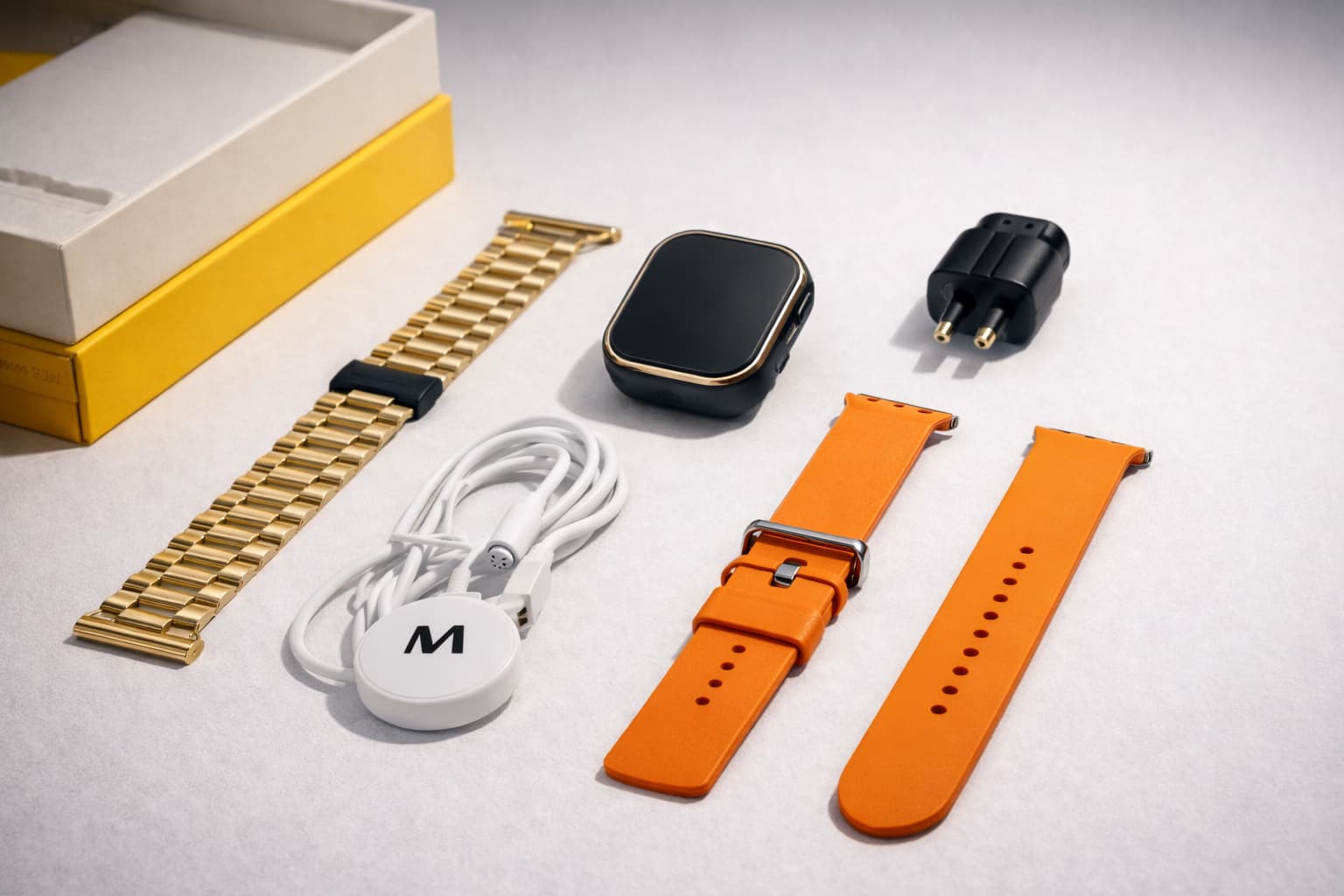 Reloj inteligente elegante que incluye correas intercambiables (metálica y deportiva), cargador y accesorios.